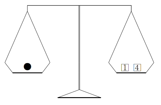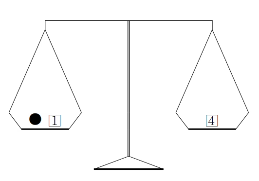 <그림 1> 구슬이 3g인지 확인하는 방법 1은 1g인 추, 4는 4g인 추, ●은 무게를 확인할 구슬)