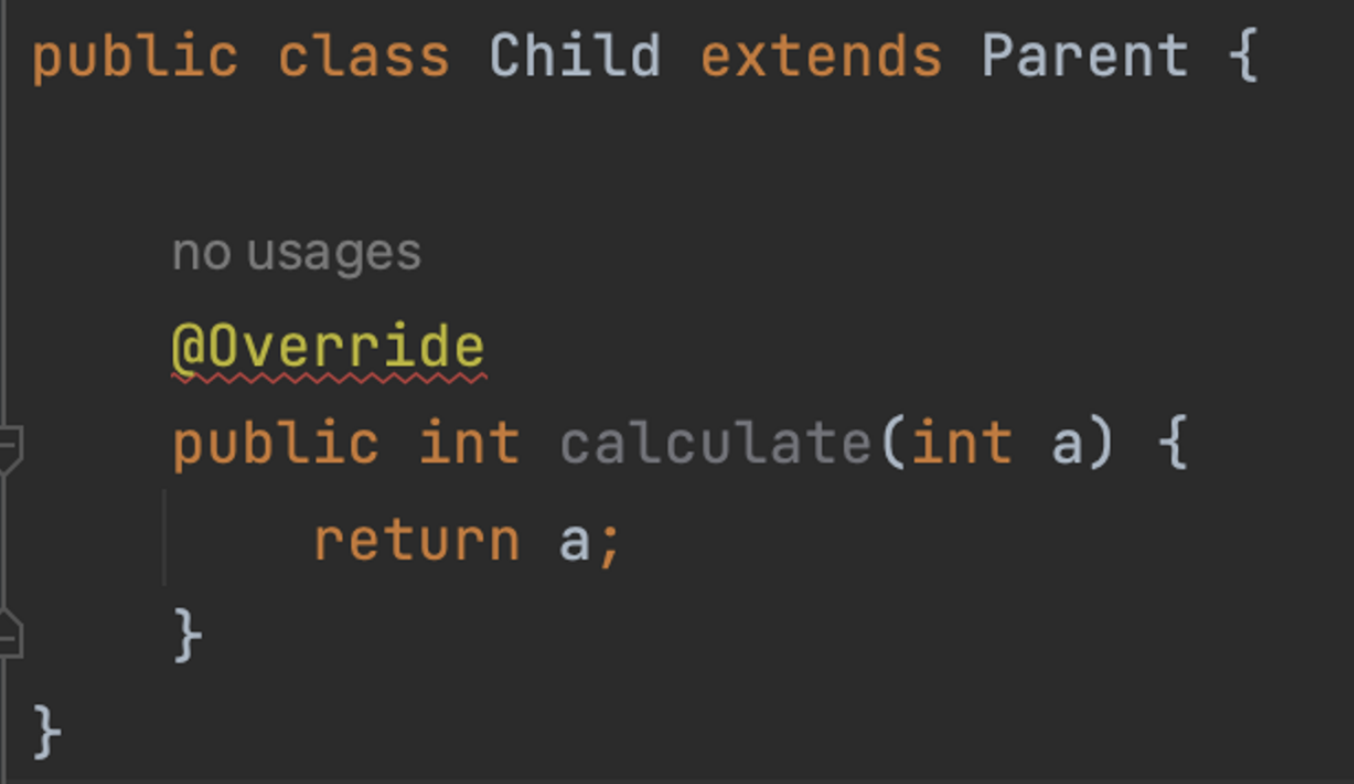 오버라이드 calculate의 매개변수를 하나 제거하면 Override에 빨간줄이 생겨 실행 전에 오류를 발견할 수 있다.